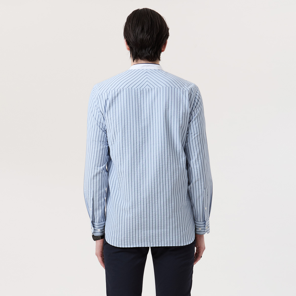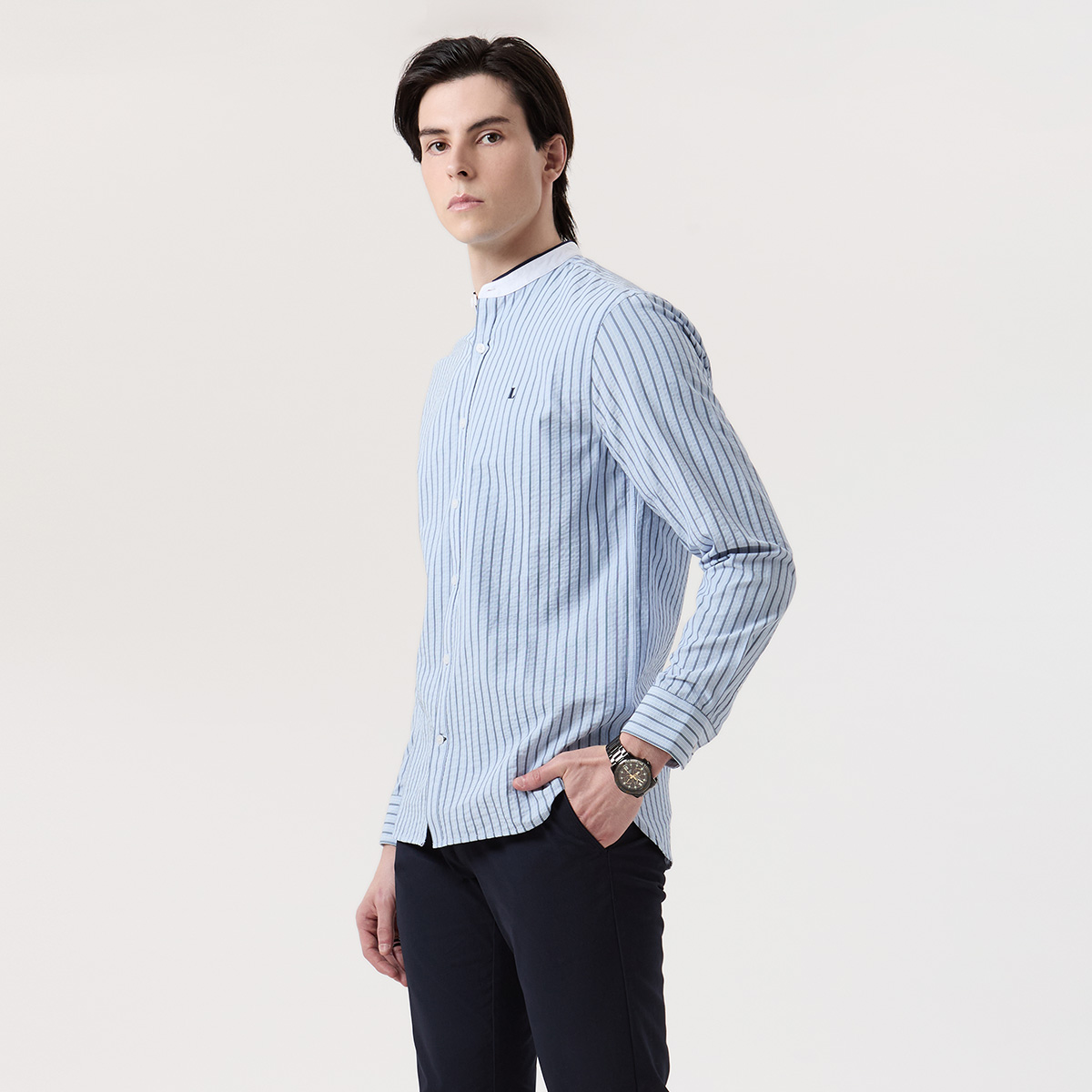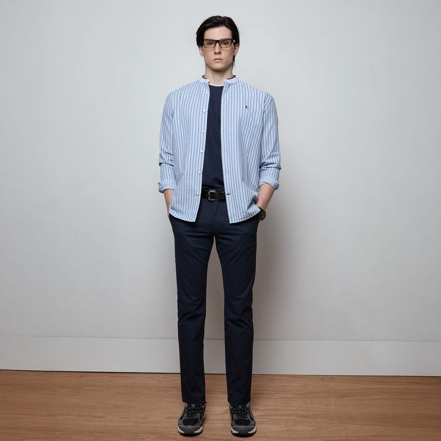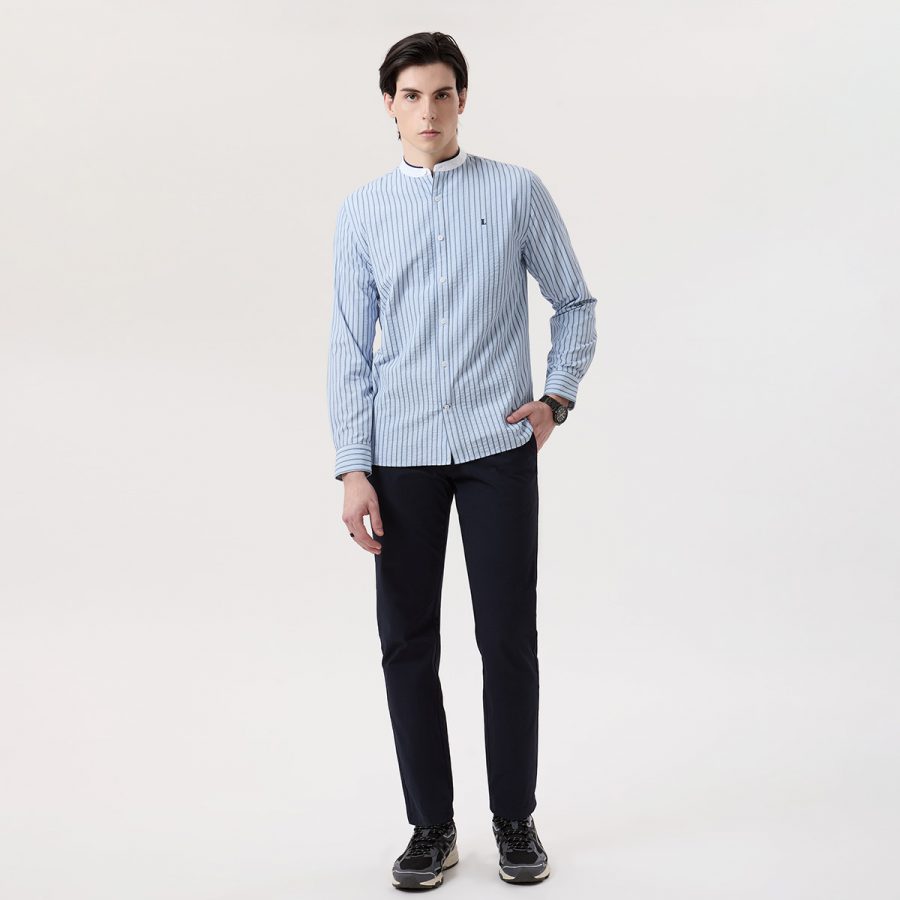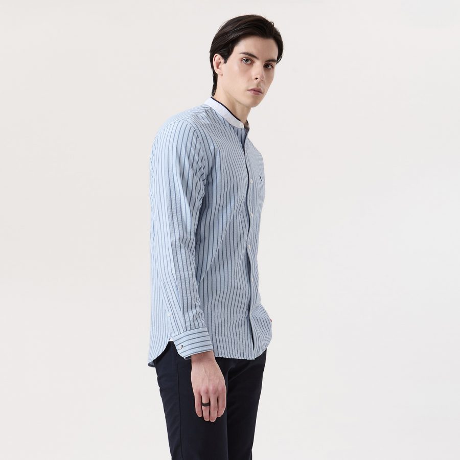 – เสื้อเชิ้ตแขนยาวคอจีนสีฟ้าลายทางแนวตั้ง