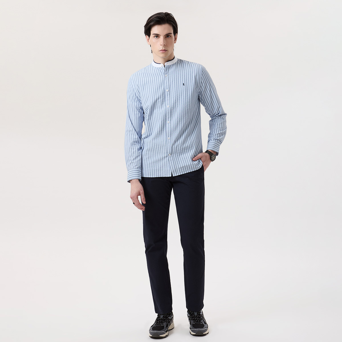 เสื้อเชิ้ตแขนยาวคอจีนสีฟ้าลายทางแนวตั้ง ดีไซน์ที่ไม่เคยตกยุค ผลิตจากผ้า Easy Iron ที่ช่วยให้ดูเรียบเนียน รีดง่าย และใช้งานสะดวก จุดขายของ คอจีน คือความสมดุลระหว่างความสุภาพและความโมเดิร์น เหมาะกับการใส่ได้ทั้งในโอกาสกึ่งทางการและวันสบาย ๆ เพิ่มลูกเล่นด้วย ปกคอแถบขาวเดินเส้นขอบด้วยสีน้ำเงิน ที่ทำให้เสื้อดูมีมิติยิ่งขึ้น ผสานเข้ากับ กระดุมเรียงเต็มแนวเสื้อ และ โลโก้ “L” ปักที่อกซ้าย ที่ช่วยเสริมความเรียบหรู เสื้อเชิ้ตตัวนี้จึงเป็นไอเท็มที่หยิบใส่ง่ายและปรับลุคได้หลากหลาย