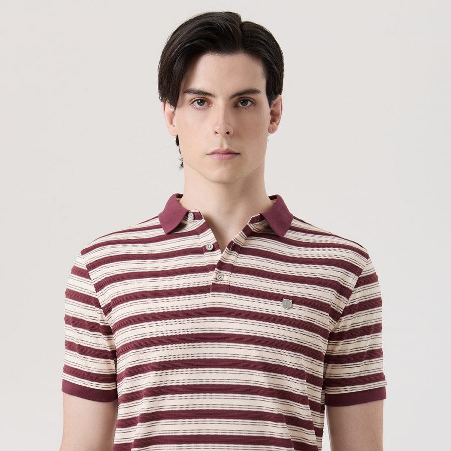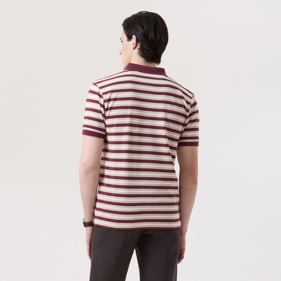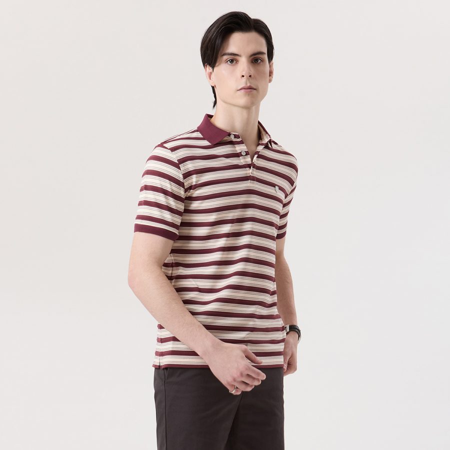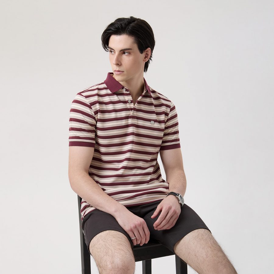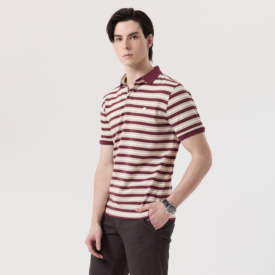 – เสื้อโปโลแขนสั้นโทนสีน้ำตาลแดงลายทาง